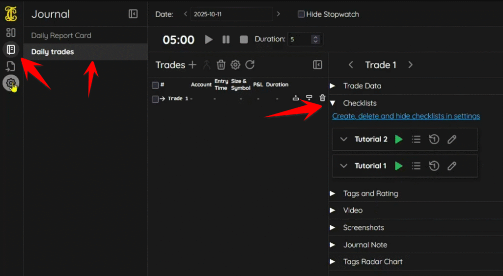 You will most likely be accessing and modifying your checklists from the Daily Trades section and not from settings. Click on the journal icon on the left navigation menu, then click Daily Trades. Add a trade or import a trade, then expand the Checklists menu, and you will see your available checklists.