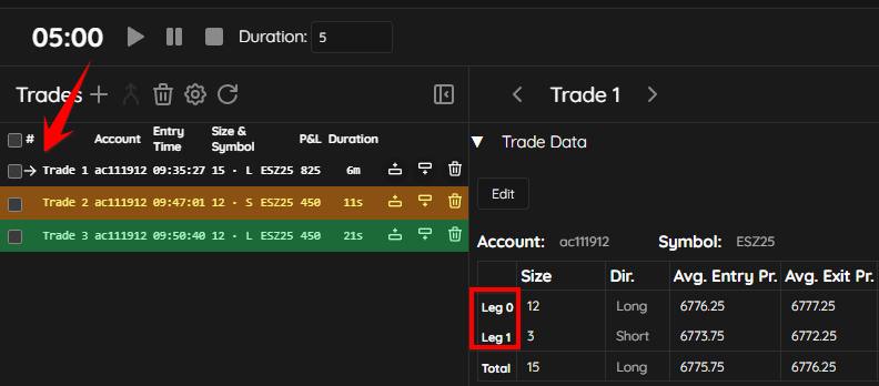 - The trades will now be merged and you will see a right pointing arrow indicating that the trades were merged. You will also see “Leg 0” and “Leg 1” under Trade Data, indicating the scale in/out of the position..