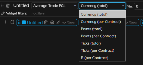 To adjust the criteria of how you view this data, you will use the dropdown next to the title of the widget (the default is Win %), but you can select any different options, then further break it down based on values such as Currency, R, Ticks, etc.